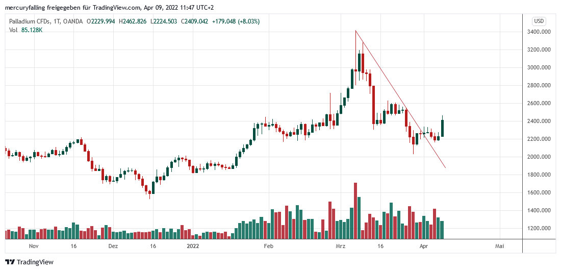 Mit diesem Kurssprung am Freitag überwand Palladium auch wieder die Widerstandszone bei 2.370 Dollar und generierte damit ein neues kurzfristiges Kaufsignal. Auf Wochencandle-Basis ist die massive Korrektur nach Erreichen des neuen Allzeithochs von 3.410,25 Dollar am 08.03.2022 zum Stehen gekommen. Bereits am 01.04.2022 hatte Palladium seinen kurzfristigen Abwärtstrend gebrochen und in der Folge auf Tagesbasis einen kleinen Doppelboden gebildet.