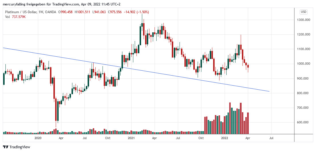 Der Platinpreis hing in dieser Woche ,,in den Seilen‘‘. Kraftlos schrammte er abwärts, auch wenn sich kein starker Verkaufsdruck zeigte. Per saldo schloss Platin im Wochenvergleich 1,5 % tiefer bei 975,56 Dollar.