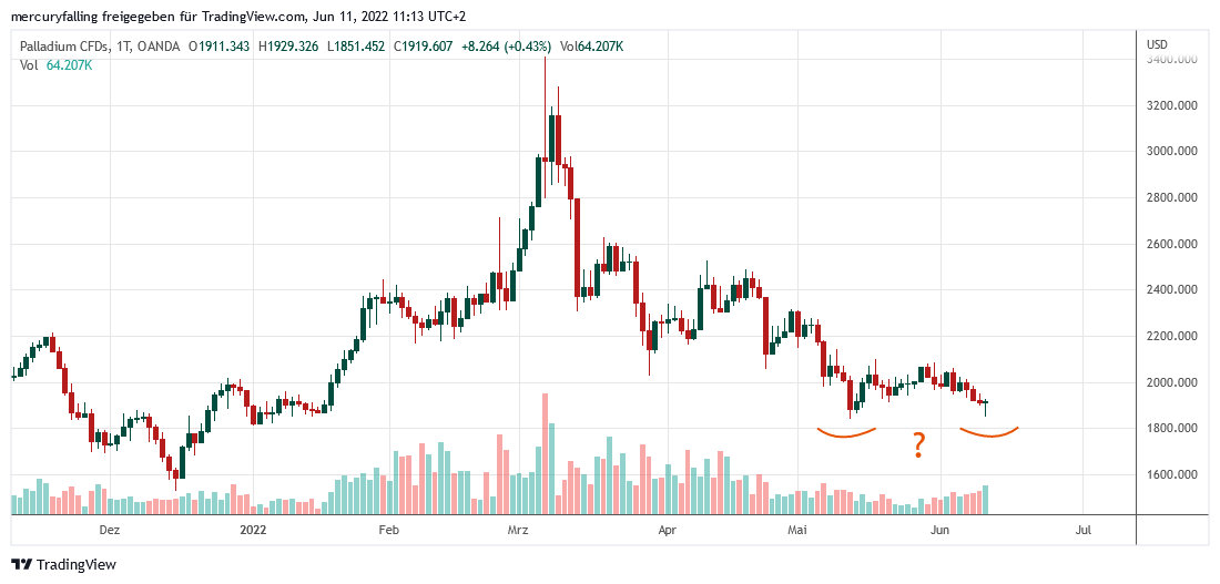 Wie auch Platin könnte Palladium vor einer ,,charttechnischen Schubumkehr‘‘ stehen, wie ein Blick auf den Tagescandle-Chart verdeutlicht. Denn sollte sich am gestrigen Freitag das zweite Tief eines Doppelbodens gebildet haben, könnten Palladium bald deutlich höher Kurse bevorstehen.