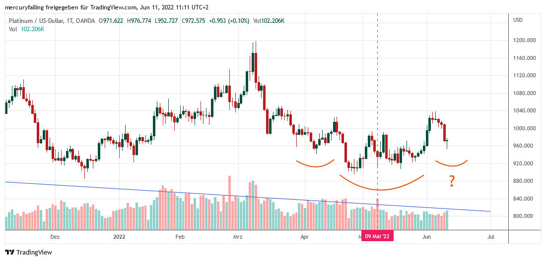 Wie der Preischart verdeutlicht, könnte es sich dabei um die Ausbildung der rechten umgekehrten Schulter einer S-K-S-Formation handeln. Aus diesem Grund dürften die nächsten Handelstage für Platin spannend werden. Denn sollte sich dieses Konsolidierungsmuster verdichten, ließe sich die gesamte Musterbildung seit September 2021 als fraktale und damit sich selbst bestätigendes Bodenmuster in Form einer umgekehrten S-K-S-Formation interpretieren.