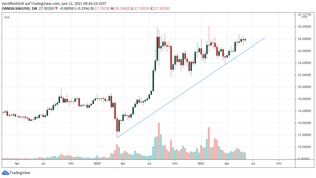 Kurzfristig ist gleichwohl die Richtungsentscheidung offen. Die seit dem Corona-Crashtief am 18.03.2020 laufende mittelfristige Trendlinie liegt derzeit bei rund 26,10 Dollar. Sollte ein Ausbruch nach oben kurzfristig nicht gelingen, ist neben einer weiteren Seitwärtsbewegung auch ein erneuter Test dieser Trendlinie möglich. Ungeachtet dessen wäre ein Wochenschluss oberhalb von 28,31 Dollar ein sehr starkes Kaufsignal.