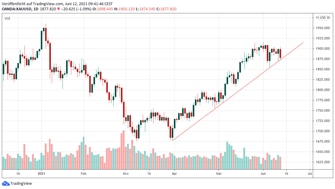 Der Goldpreis bewegte sich im Wochenverlauf zunächst in engen Spannen seitwärts, bevor er dann am Freitag im Zuge eines schnell erstarkenden US-Dollars nachgab und mit einem Wochenverlust von 1 % bei 1.877,82 Dollar schloss. Dabei testete er, wie der Chart zeigt, auch seine seit dem 31.03.2021 laufenden mittelfristige Trendlinie.