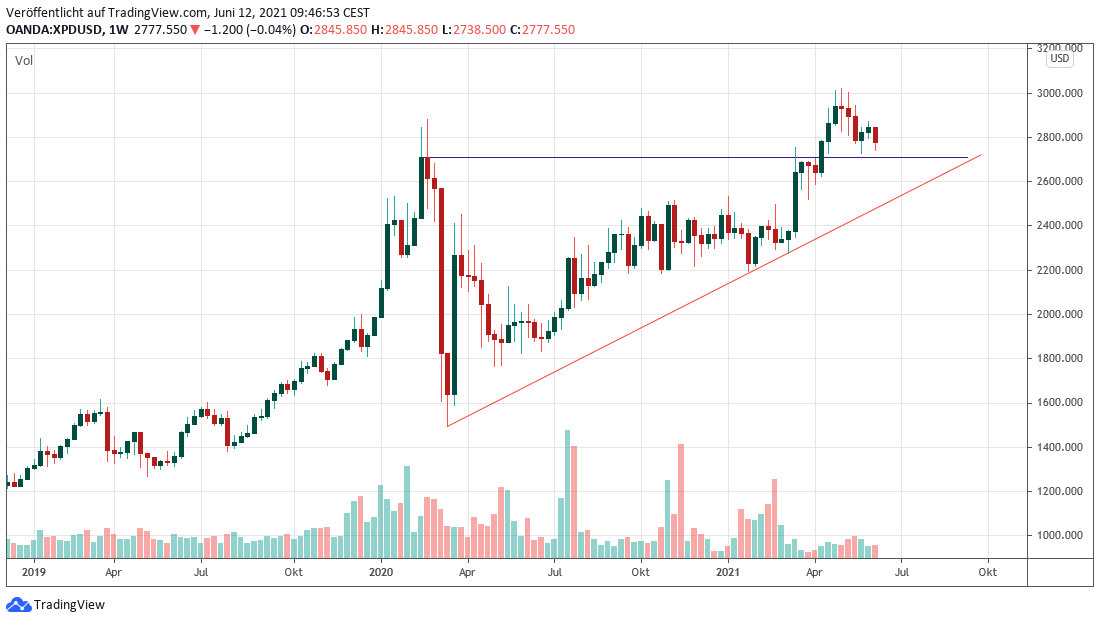 Insgesamt hat sich die charttechnische Lage bei Palladium etwas verschlechtert, wenngleich auf hohem Niveau. Die niedrigen Umsätze deuten zudem darauf hin, dass kein großer Verkaufsdruck besteht.