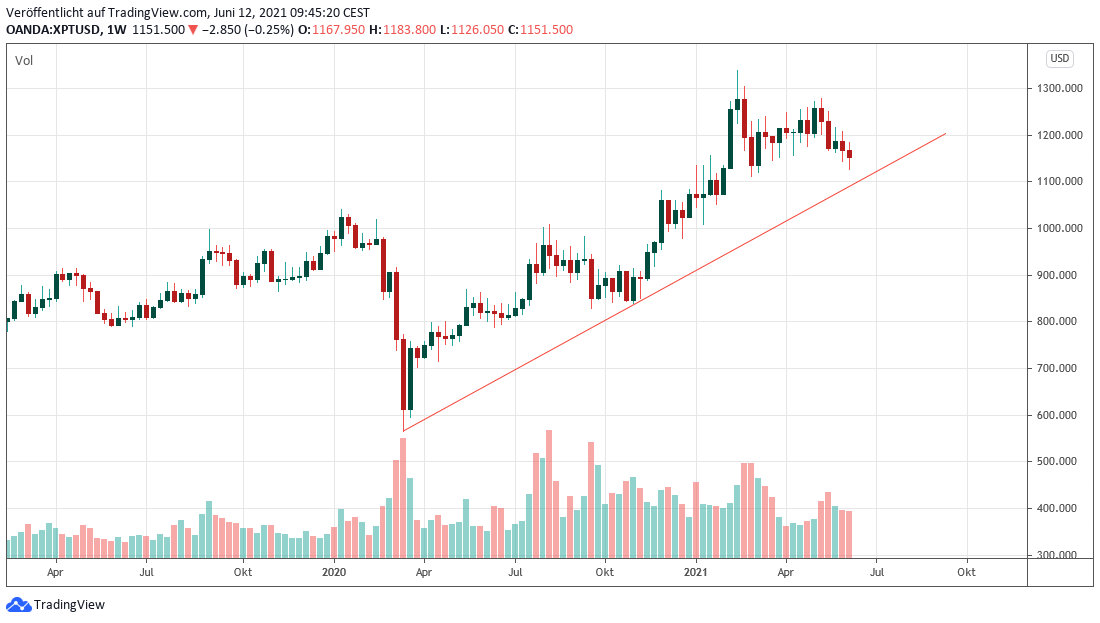 Palladium gab in dieser Woche am deutlichsten nach und verlor saldo 2,4 % auf 2.777,55 Dollar. Dabei unterschritt es die steilere, seit dem 09.03.2021 laufende steilere Aufwärtstrend-Linie. Sollte der Palladiumpreis die Unterstützung bei 2.727,30 Dollar unterschreiten, könnte ein Test der flacheren Unterstützungslinie anstehen, die ihren Ausgangspunkt am 19.03.2020 hat.