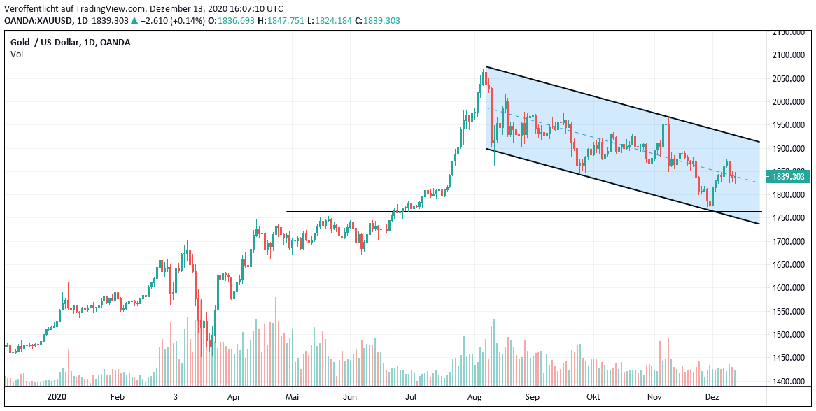 Auf der anderen Seite machen sich aber auch weiterhin exakt in der neutralen Mitte des bestehenden Abwärtstrendkanals, geprägt durch den zunehmend verfestigten Konjunkturoptimismus der meisten Marktteilnehmer für das Jahr 2021, unverändert offensichtliche Ermüdungserscheinungen in der Erholung des Goldpreises breit. Dies lässt es aus unserer Sicht nicht ausgeschlossen sein, dass der Goldpreis in den nächsten Tagen erneut zu einem weiteren Test der Marke von 1765 USD ansetzen könnte.