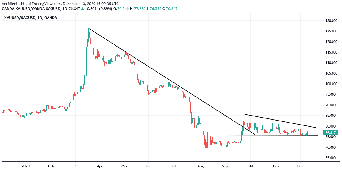 Dieses aktuell zu Gold erhöhte Korrekturrisiko von Silber ist auch daran ablesbar, dass sich die Gold-Silber-Ratio in der letzten Woche weiter von ihrem kritischen Unterstützungsniveau von 76 nach oben entfernt hat, wenn auch nur unwesentlich. Das gegenwärtige Pendeln der Gold-Silber-Ratio im neutralen Rahmen einer seit Ende September etablierten Seitwärts-Konsolidierung lässt jedoch zumindest einen regelrechten Silberpreis-Crash im Falle einer weitgehenden Stabilität des Goldpreises kurzfristig sehr unwahrscheinlich werden.