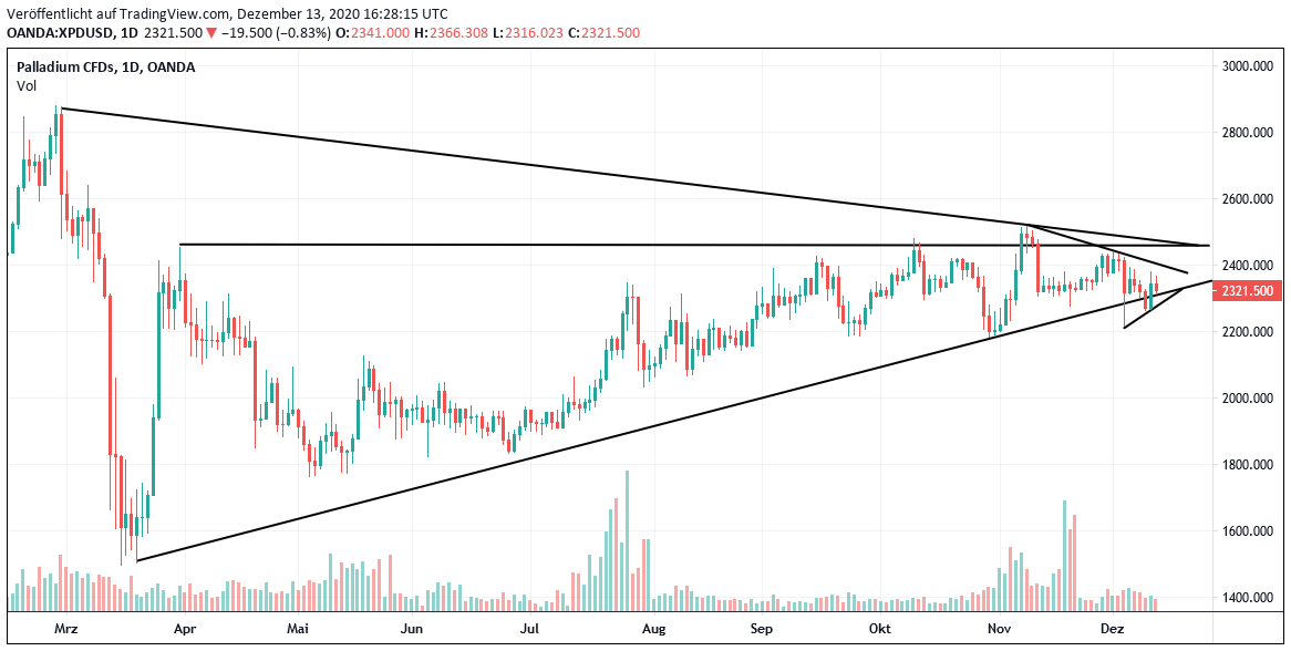 Damit gelang dem Palladium-Preis zum Freitags-Schluss wenigstens die erneute Rückkehr in den aktuell noch Aufwärtstrend-bestätigenden Bereich oberhalb von 2300 USD, nachdem dieser in der zurückliegenden Woche gleich zweimal aufeinanderfolgend erneut mit jeweiligen Tagestiefs von 2260 - 2265 USD verletzt worden war.