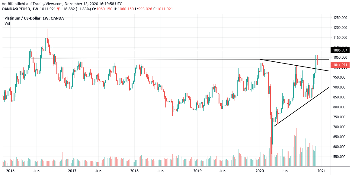 Der durch seine starke Abhängigkeit vom Automobil-, Schmuck- und Medizingeräte-Sektor natürlich insgesamt noch deutlich konjunkturanfälligere Platin-Preis, als dies für Gold und Silber gilt, setzte mit seinem Wochentief von nur 993 USD nun sogar exakt auf dem Niveau seines jüngsten Dreiecks-Ausbruchs auf, dessen nochmalige nachhaltige Unterschreitung damit dann wohl definitiv den erneuten Rückfall des Platin-Preises in seine Anfang 2020 eingeleitete Dreieckskonsolidierung bedeuten würde.