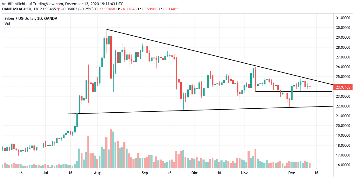 Noch stärker als der Goldpreis steht aktuell der Silberpreis damit unter dem Eindruck kurzfristig weiterhin verhaltener, für 2021 jedoch deutlich günstiger ausfallender globaler Wirtschaftsperspektiven. Es gilt daher für den Silberpreis, die auch in der letzten Woche erneut näherungsweise angetestete kurzfristige horizontale Unterstützungsmarke von 23,50 USD unbedingt zu verteidigen, um einen hypothetisch noch ausgeprägter als im Gold möglichen Rückschlag bis auf die nächste Unterstützung von 22,00 USD (= - 8 % vom aktuellen Kursniveau, - 6,4 % vom nächsten Unterstützungsniveau von 23,50 USD aus) zu verhindern.