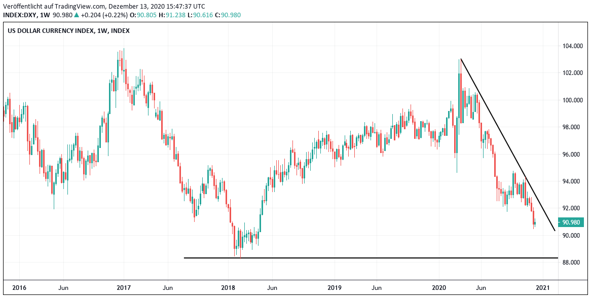 Die nur sehr geringfügige Stabilisierung des US-Dollars in der letzten Woche reflektierte dabei in angemessener Weise, dass zwar nun seit gestern und weiter in den nächsten Tagen Notfall-Anwendungsgenehmigungen der nationalen Gesundheitsbehörde FDA für die Corona-Impfstoffe von Pfizer/BioNTech und Moderna mit künftigen Beiträgen zu einer deutlichen Wirtschaftsstabilisierung erfolgen werden.