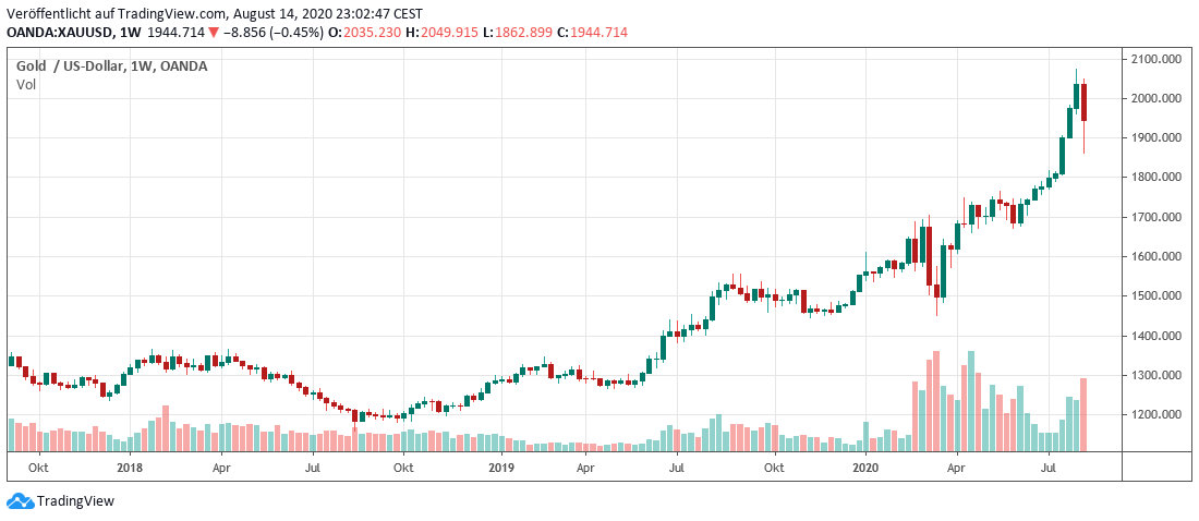Der Goldpreis korrigierte im Berichtszeitraum seine zuvor aufgebauten Gewinne und schloss im Wochenvergleich 4 % tiefer bei 1.944,60 Dollar, konnte sich aber auf Wochenschlussbasis über dem bisherigen Allzeithoch von 1.921 Dollar halten.
