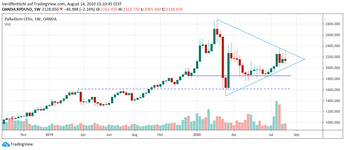 Auch bei Palladium ist noch offen, wie lange die bislang eher stürmische Konsolidierung noch andauert. Nimmt man statt eines Doppelbodens das Chartmuster eines sich zuspitzenden Dreiecks als Interpretationsrahmen, so könnte sich Palladium auch noch einige Wochen mit geringen Schwankungen seitwärts bewegen.