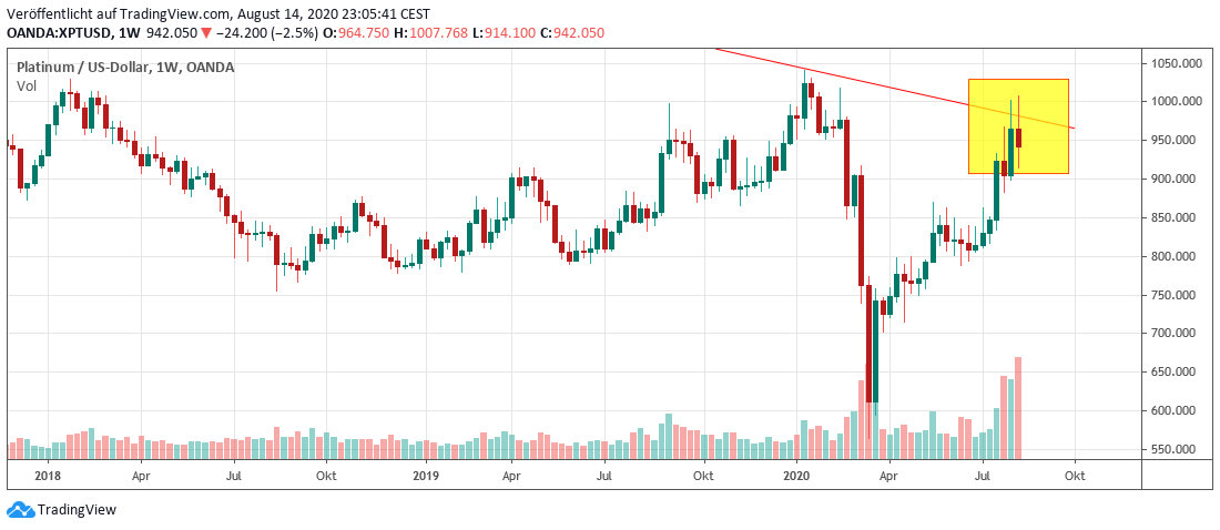 Ein Blick auf den Preischart zeigt, dass Platin auch in dieser Woche den langfristigen Abwärtstrend kurzfristig durchstoßen hatte, dann aber wieder darunterfiel und schloss.