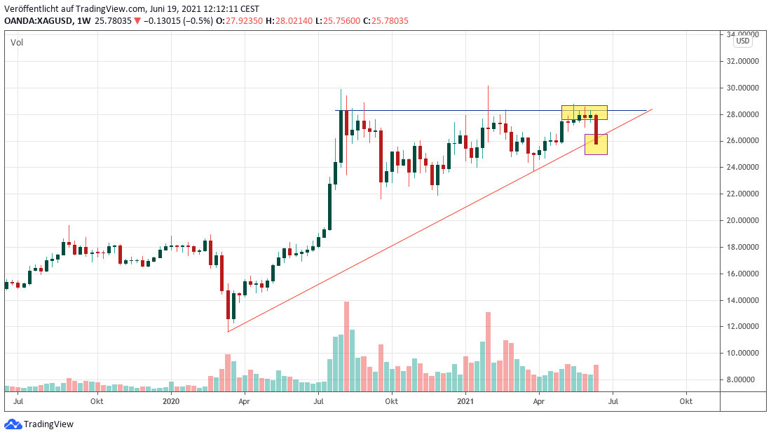 Charttechnisch sieht die Einschätzung aber anders aus. Denn der Silberpreis hat nun auch Wochencandle-Basis seinen seit dem Corona-Crash laufenden mittelfristigen Aufwärtstrend unterschritten. Auch hier waren die ruhigen Handelstage seit Mitte Mai 2021 anscheinend die ,,Ruhe vor dem Sturm‘‘. Mustertechnisch hat Silber damit ein Doppeltop gebildet und könnte nun bis auf seine Ausbruchslinie zurückfallen, die bei 21,13 Dollar liegt.