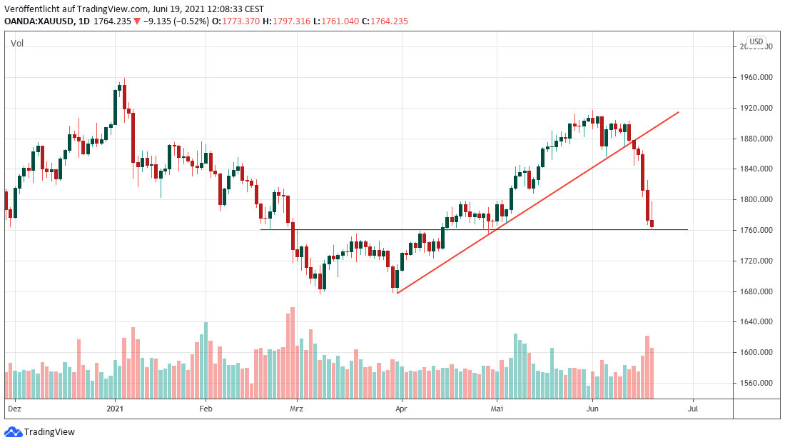 Im Rückspiegel erwies sich die niedrige Volatilität seit Mitte Mai für den Goldpreis als trügerisch. Denn direkt zu Wochenbeginn brach Gold seinen seit 31.03.2021 laufenden Aufwärtstrend und beschleunigte diese Abwärtsbewegung dann im Wochenverlauf mit richtungsbestätigenden deutlich steigenden Umsätzen. Der Wochenverlust lag schließlich bei 6 % und der Schlussstand bei 1.764,24 Dollar.