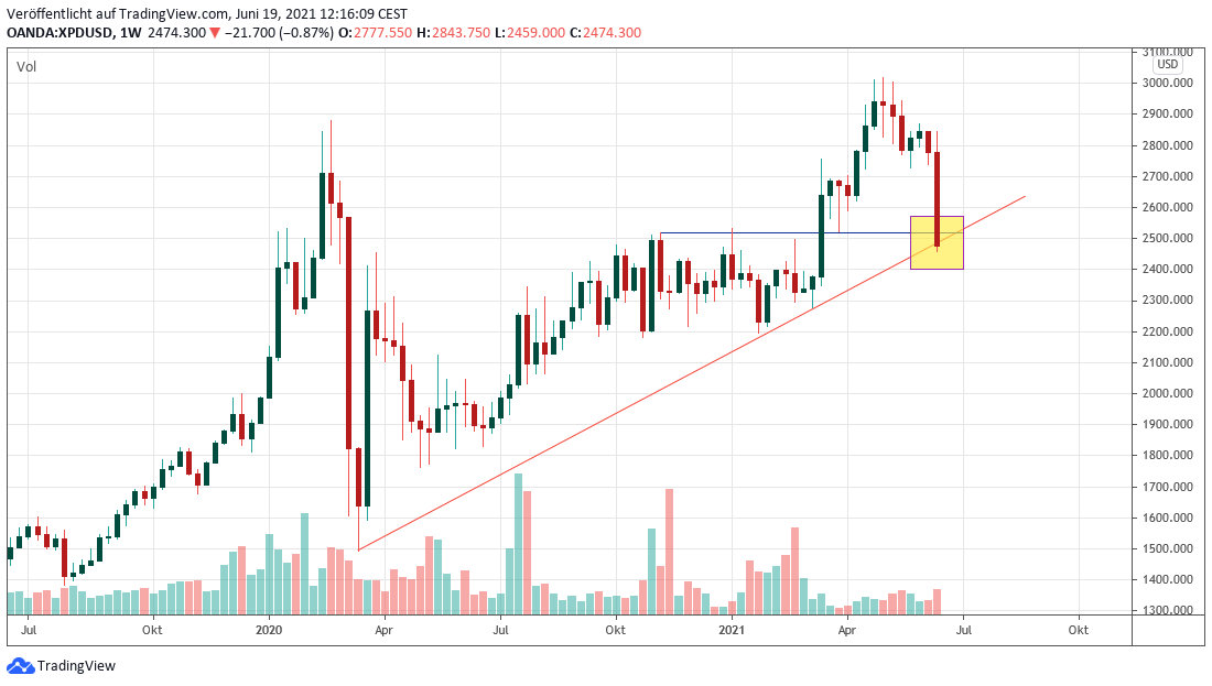 Palladium zeigte in dieser Woche die schwächste Entwicklung unter den Edelmetallen und verlor per saldo 10,9 % auf 2.474,30 Dollar. Dabei unterschritt es nach der steileren Aufwärtstrendlinie in der Vorwoche nun auch seinen flacheren Aufwärtstrend, der seinen Ausgangspunkt am 19.03.2020 hat, und generierte damit ein kurzfristiges Verkaufssignal, wenn auch bei für die Höhe des Verlustes erstaunlich geringen Umsätzen, gerade auch im Vergleich zu seinen Schwestermetallen. Dadurch ist nun aber die Möglichkeit eines Fehlsignals gegeben, zumal die Aufwärtstrendlinie nicht so signifikant unterschritten wurde wie im Falle von Silber und Platin.