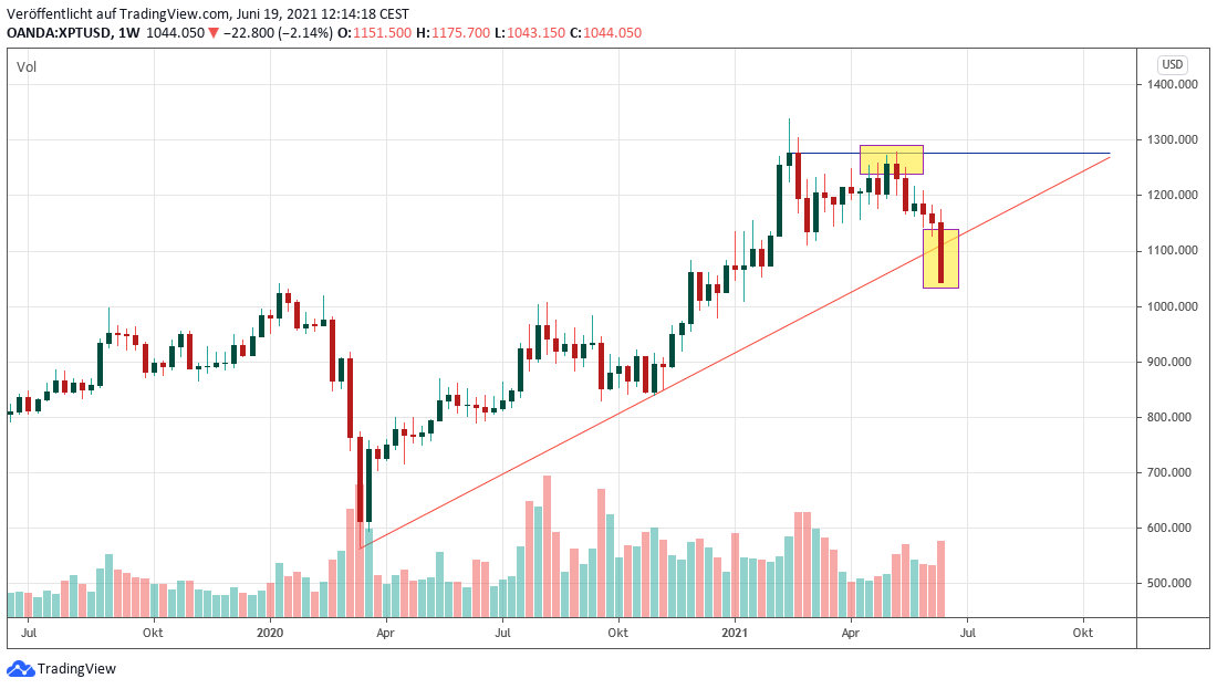 Gleichwohl ist nun erhöhte Vorsicht geboten. Im Bereich um 1.000 Dollar liegt eine nächste ,,weiche‘‘ Unterstützungszone auf Tagescandle-Basis, die bereits halten könnte. Vor einer überzeugenden neuen Aufwärtsbewegung sollte Platin nun erst einmal einen, wenn auch nur kurzfristigen, Boden bilden.