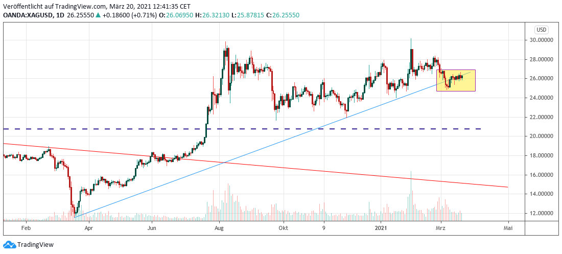 Insgesamt verharrt der Silberpreis in einer gespanten Wartestellung. Gestützt wird er dabei von einer ansteigenden Inflationserwartung.
