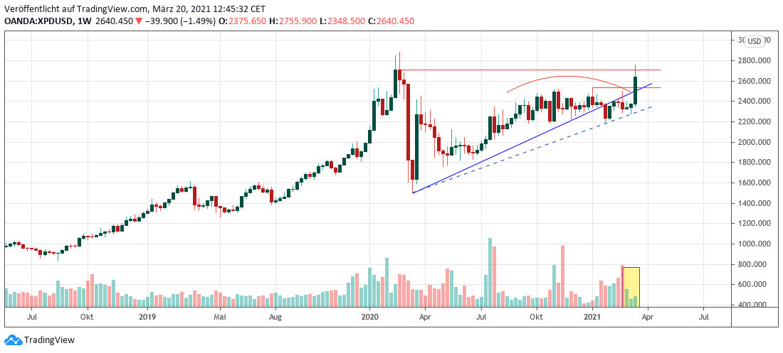 Ausreißer der Edelmetallwoche war diesmal Palladium. Getrieben von den Nachrichten von einem der weltgrößten Palladiumproduzenten, Nornickel, der seine Produktionsprognose für dieses Jahr deutlich zurücknahm, sprang der Palladiumpreis um 11,1 % auf 2.640,45 Dollar nach oben.