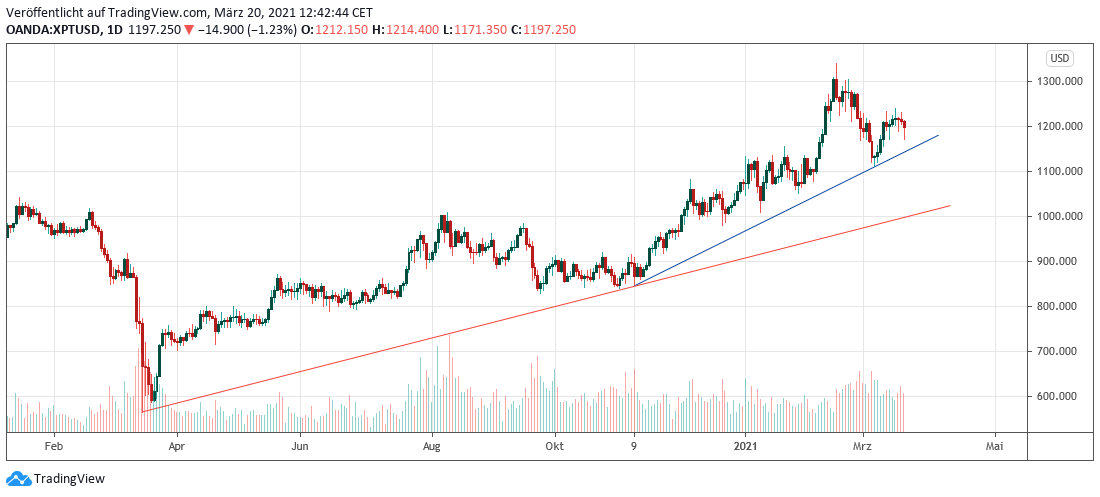 Platin gab in dieser Woche 0,7 % auf 1.197,25 Dollar nach und konsolidierte dabei den deutlichen Anstieg aus der Vorwoche. Wie das Chartbild zeigt, ist kurzfristig sowohl eine kleine umgekehrte S-K-S-Formation möglich, aber auch ein erneuter Test der mittelfristigen Aufwärtstrendlinien.