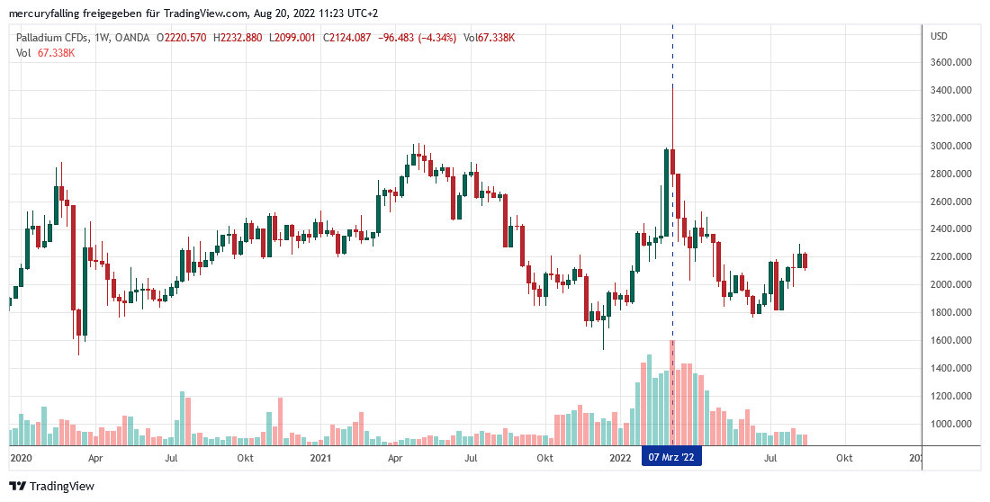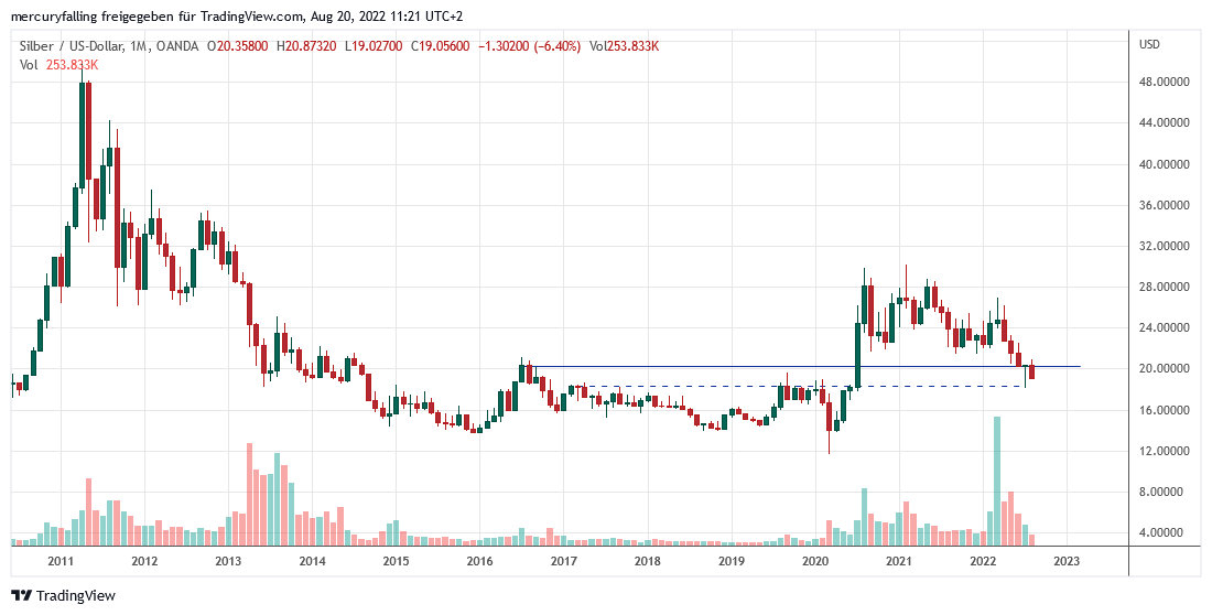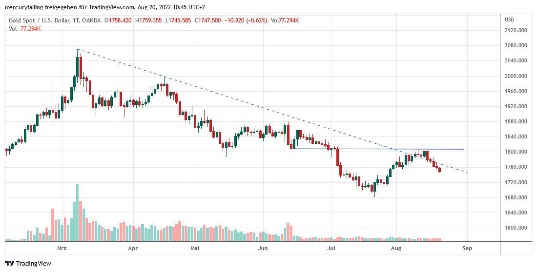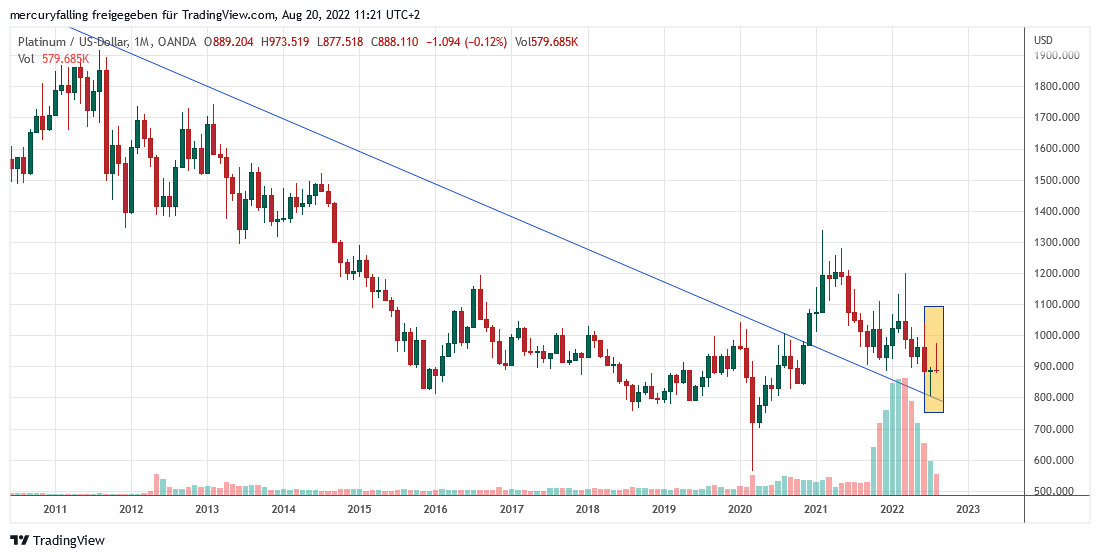 Damit hat Platin die Gewinne der beiden Vorwochen praktisch wieder abgegeben. Auf Monatscandle-Basis hat Platin damit dem langen unteren Docht vom Juli einen bislang langen oberen Docht folgen lassen. Dies bedeutet zwar noch keine Schubumkehr, ist aber ein Warnsignal für einen möglichen Monatsultimo im August 2022.