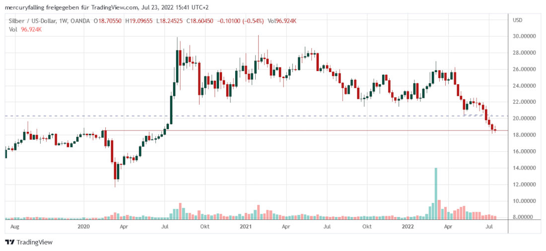 Zwar unterschritt das Tief der Vorwoche nicht, ein Anlauf für eine stärkere Erholung blieb aber erfolglos. Nun liegen die charttechnischen Hoffnungen der Silber-Bullen vor allem auf einem starken Aufwärtsimpuls nach der Sitzung der US-Notenbank am 27.07.2022.