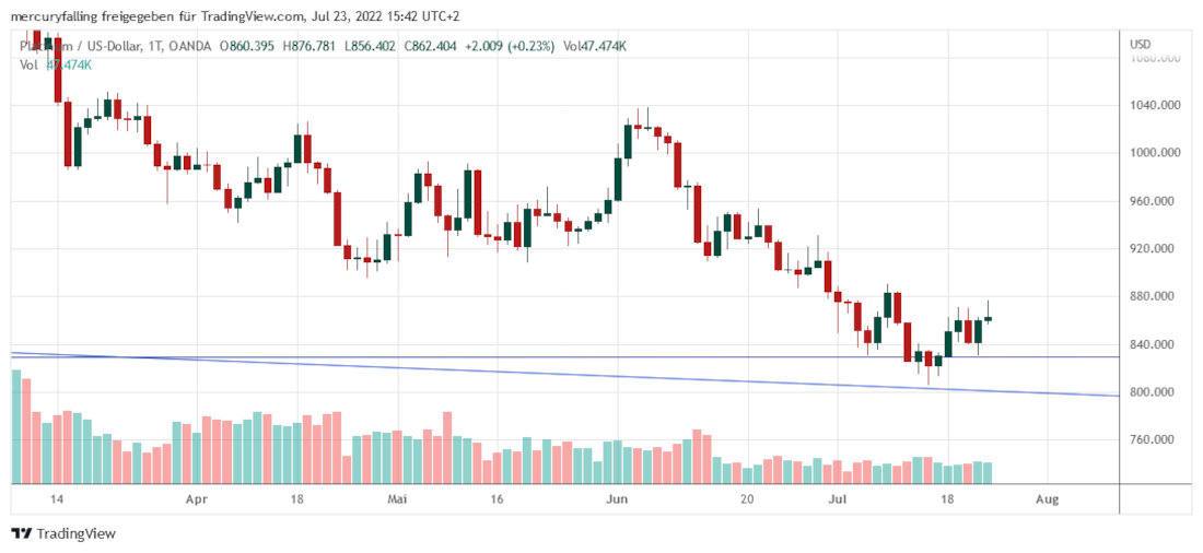 Die Lage am Terminmarkt zeigt zudem eine gegenläufige Entwicklung im Vergleich zu Gold, Silber und Palladium. Denn die CoT-Daten vom 19.07.2022 zeigen einen erneuten Vorzeichenwechsel bei der Position der Commercials. Diese sank um 1.508 Kontrakte, fiel zurück in eine Short-Position in Höhe von - 273 Kontrakten.