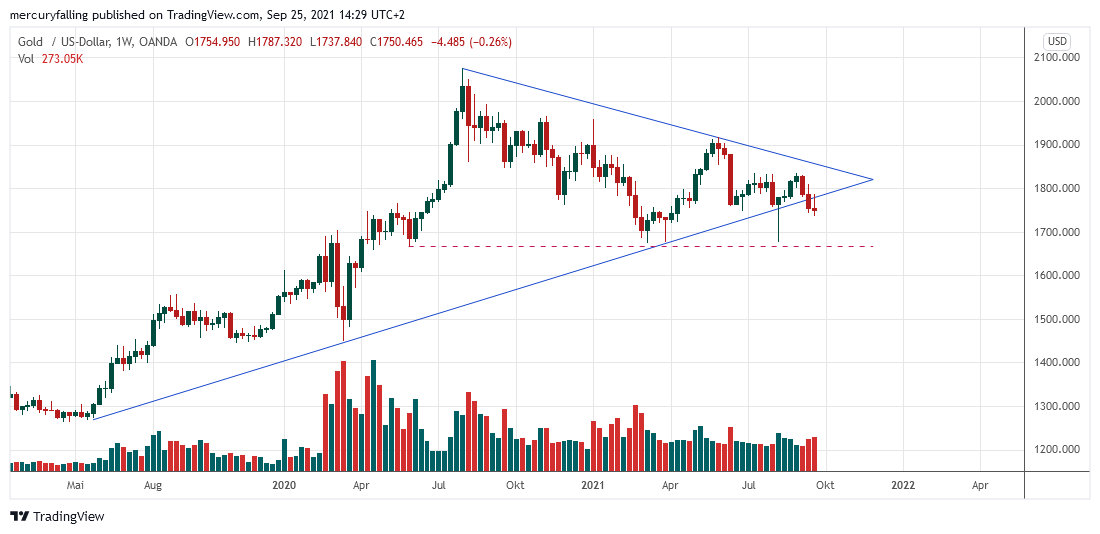 Der Goldpreis gab im Wochenvergleich leicht um 0,3 % auf 1.750,47 Dollar nach. Er prallte im Wochenverlauf an seiner zuvor bereits unterschrittenen mittelfristigen Aufwärtstrend-Linie ab, wahrte aber mustertechnisch seine Chance, oberhalb des Tiefs vom 09.08.2021 bei 1.677,69 Dollar einen zweiten Doppelboden zu bilden, der dann zusammen mit seinem ersten Doppelboden vom März 2021 einen doppelten Doppelboden und damit eine solide Bodenformation darstellen würde. Unterhalb dieser Marke ist allerdings ein schneller Rückgang bis in die Unterstützungszone bei 1.600 Dollar zu erwarten.