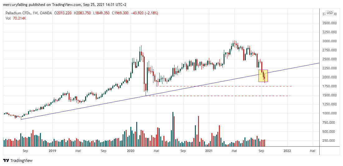 Zudem hat es Palladium seit dem 14.09.2021 nicht geschafft, seine an diesem Tag gebrochene Aufwärtstrendlinie zurückzuerobern. Sollte nun die Unterstützung bei rund 1.763 Dollar, dem Zwischentief vom 05.05.2020, nicht halten, ist mit einem schnellen Rückgang in den Bereich um 1.500 Dollar zu rechnen.
