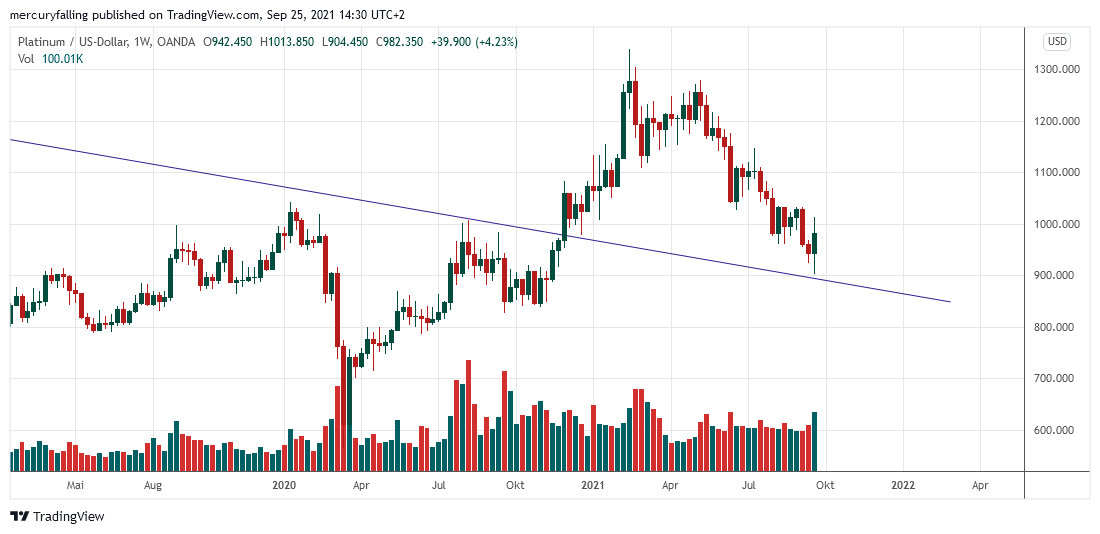 Platin konnte sich nach dem scharfen Abverkauf der Vorwochen in dieser Woche etwas stabilisieren und legte im Wochenvergleich um 4,2 % auf 982,35 Dollar zu. Dabei testete Platin im Wochenverlauf mit einem Tief von 904,45 Dollar seine langfristige Abwärtstrend-Linie, welche aktuell bei rund 895 Dollar verläuft. Damit wäre eine idealtypische Korrektur des starken Anstieges zwischen November 2020 und Februar 2021 aus dynamischer Sicht beendet.