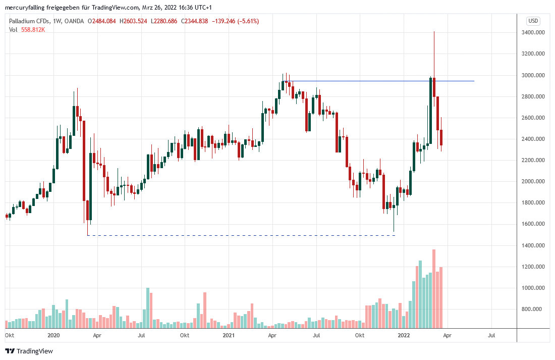 Insgesamt bleibt Palladium auch weiterhin eine charttechnisch ,,heiße Kartoffel‘‘, denn die Bedeutung Russlands für das weltweite Palladiumangebot stellt einen kurzfristig kaum zu kompensierenden ,,Angebots-Stressfaktor‘‘ dar. Die extrem hohen Umsätze vom 07.03.2022 und die sich anschließende kurzfristige Trendumkehr in Kombination mit der neuesten charttechnischen Schwäche mahnen auch bei Palladium zur Vorsicht!