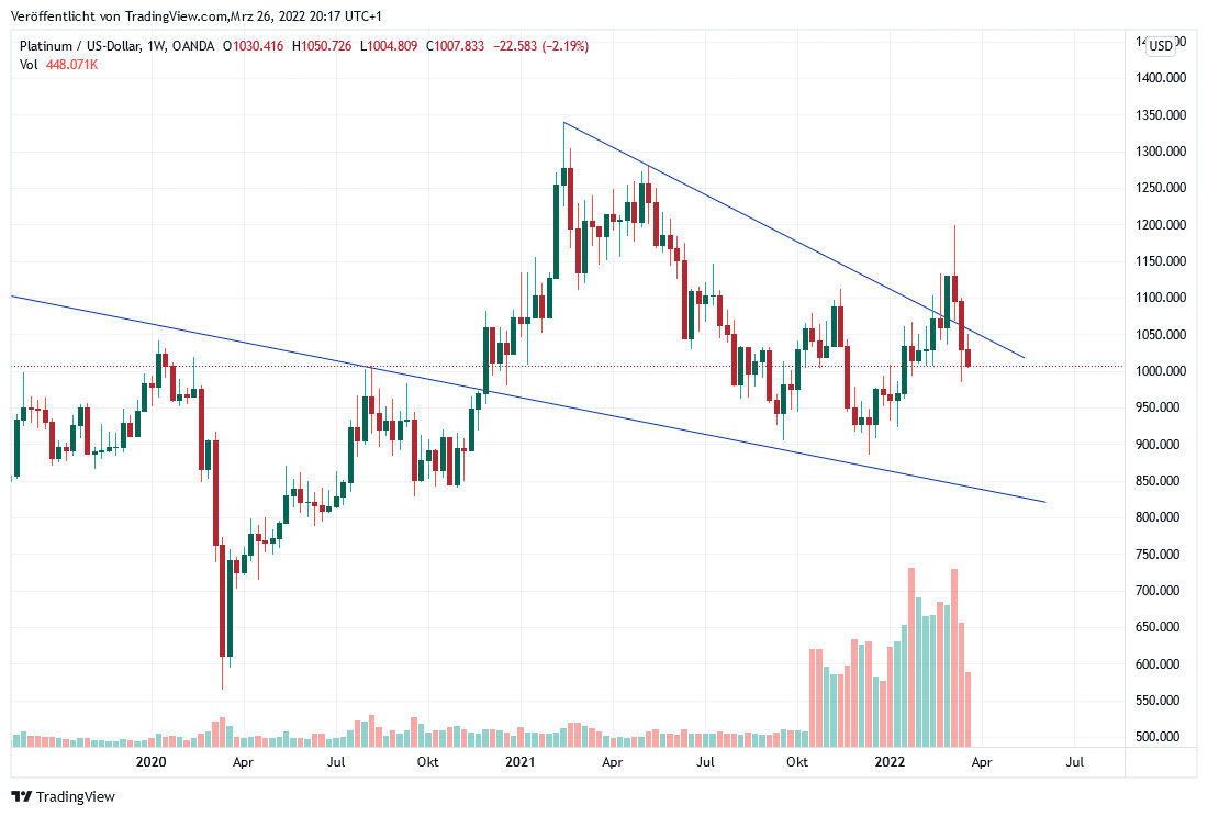 Die charttechnische Situation hat sich gleichwohl weiter eingetrübt, denn Platin konnte sich, anders als Silber, nicht wieder über seine mittelfristige Abwärtstrend-Linie hangeln.