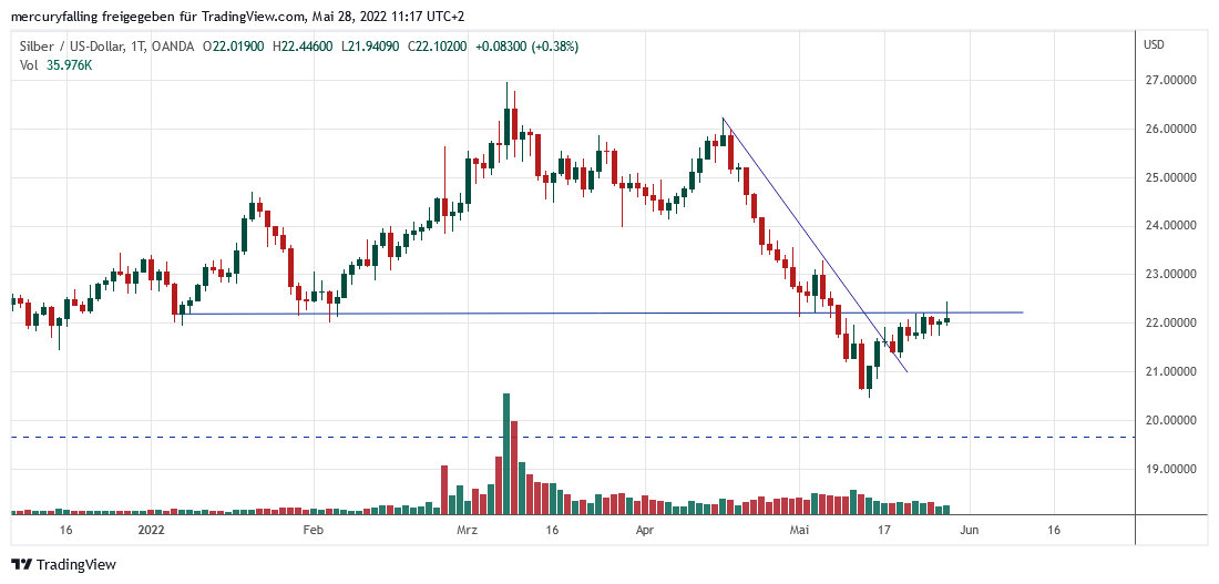 Silber gewann in dieser Handelswoche 1,6 % auf 22,10 Dollar und erholte sich damit weiter von dem regelrechten Absturz zwischen dem 19.04.2022 und dem Jahrestief am 13.05.2022 bei 20,46 Dollar.
