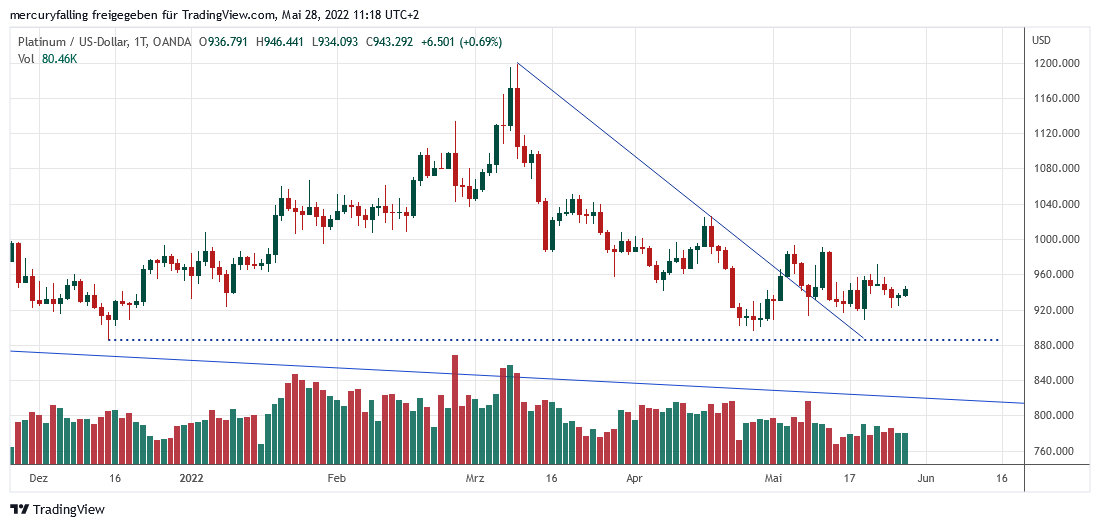 Dabei läßt sich aber vermuten, dass Platin aktuell weiter einen Kursboden oberhalb des Tiefs vom 15.12.2021 bei 885,34 Dollar bildet.