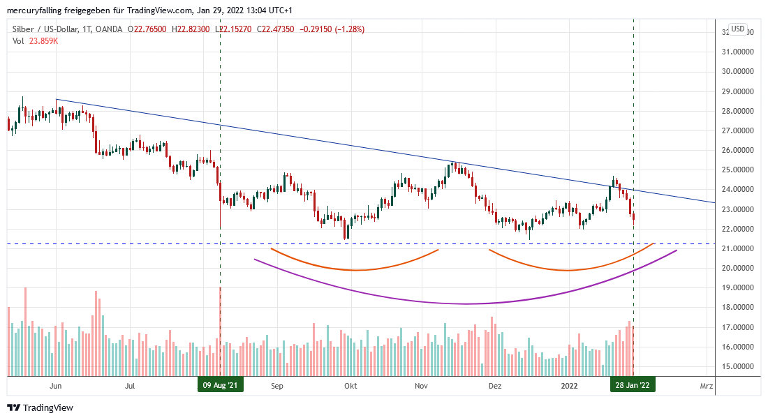Wie ein Blick auf den Kurs-Chart zeigt, gab Silber unter hohen Umsätzen nach, was das Risiko im Vergleich zu Gold höher erscheinen läßt, dass es sich bei der Abwärtsbewegung nicht um ein Fehlsignal handelt. Allerdings spricht die seit August 2020 und insbesondere seit dem Absturz am 09.08.2021 gebildete Chartstruktur gegen einen deutlich tieferen Silberpreis.