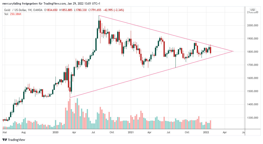 Der Goldpreis gab in diesem turbulenten Umfeld 2,3 % auf 1.791,66 Dollar ab. Dabei schloss er wieder unter seiner mittelfristigen Abwärtstrendlinie und bleibt damit weiter in der Warteschleife für einen Ausbruch aus dem mittelfristigen Konsolidierungskeil.