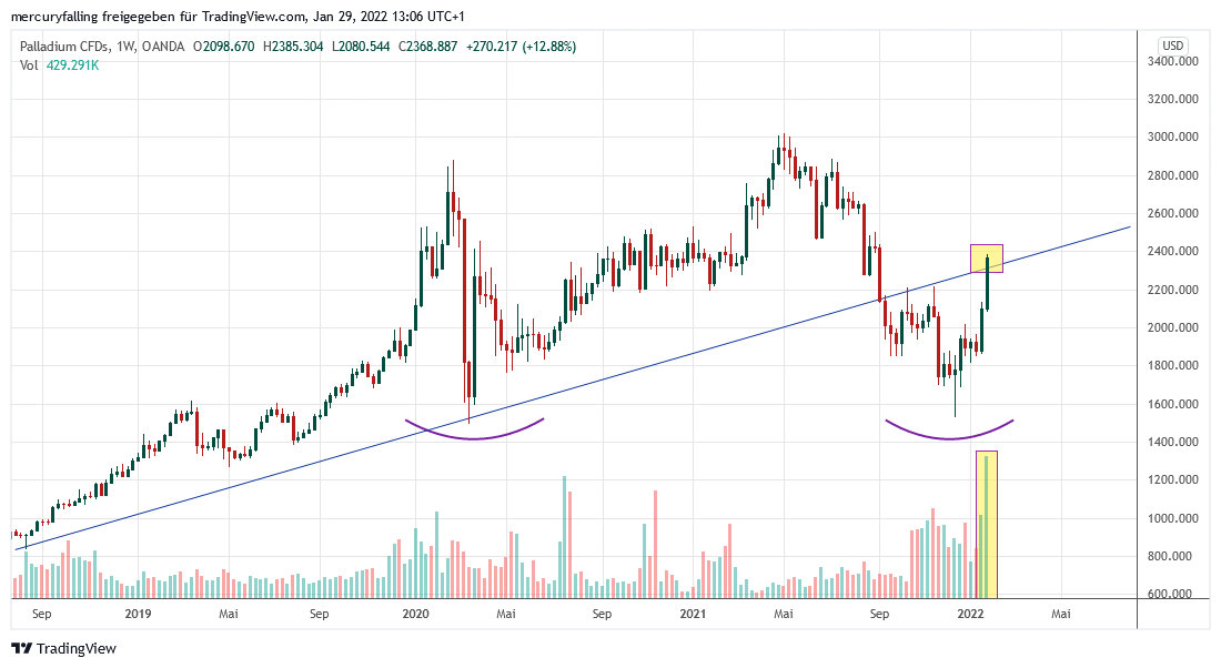 Aus der Sicht dynamischer Trendindikatoren überwand das weiße Edelmetall damit auch seine seit Mitte Juli 2021 laufende mittelfristige Abwärtstrend-Linie. Mustertechnisch verstärkte sich dadurch die Wahrscheinlichkeit, dass Palladium einen großen Doppelboden gebildet hat. Dies deuten auch die anhaltend sehr hohen Umsätze hin.