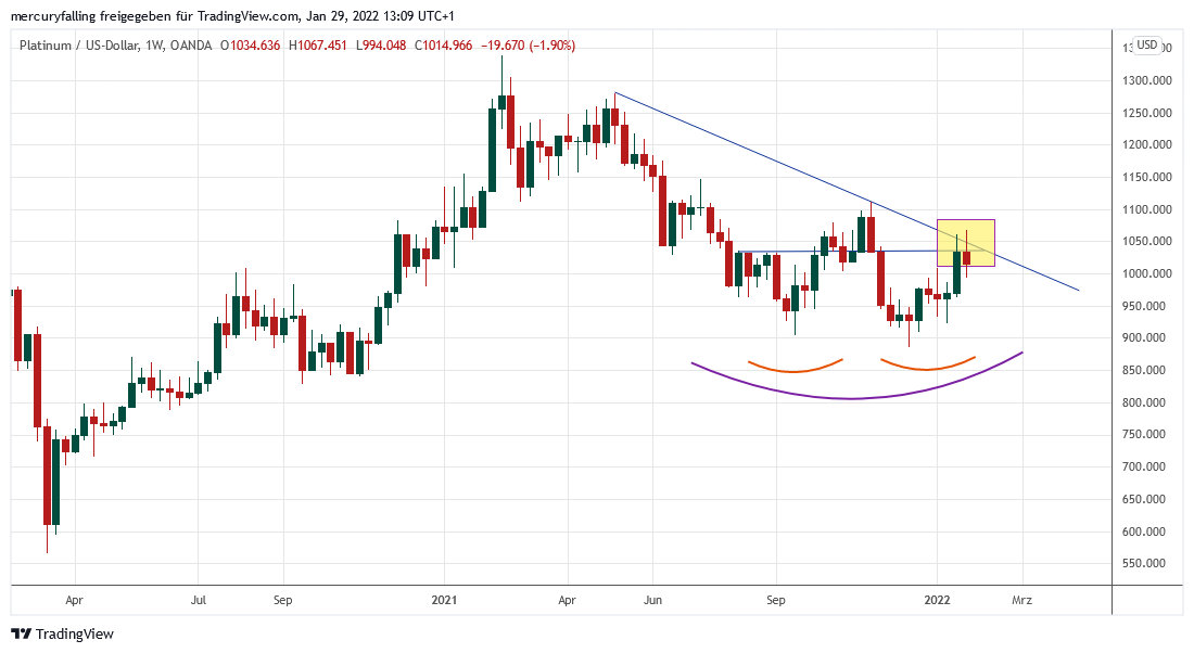 Platin gab in dieser Handelswoche ,,nur‘‘ 1,9 % auf 1.014,97 Dollar ab und konnte damit den im Wochenverlauf markierten Bruch seiner mittelfristigen Abwärtstrend-Linie wie auch Gold (noch) nicht bestätigen. Wie ein Blick auf den Wochencandle-Chart zeigt, läßt sich dies mit der im August 2021 gebildeten Widerstandszone plausibilisieren. Aus dieser Perspektive wäre ein sogar ein nochmaliger weiterer Rückgang bis in die Nähe des Unterstützungsniveaus oberhalb von 980 Dollar möglich, ohne dass es zu einer Änderung der charttechnischen Musterlage käme.
