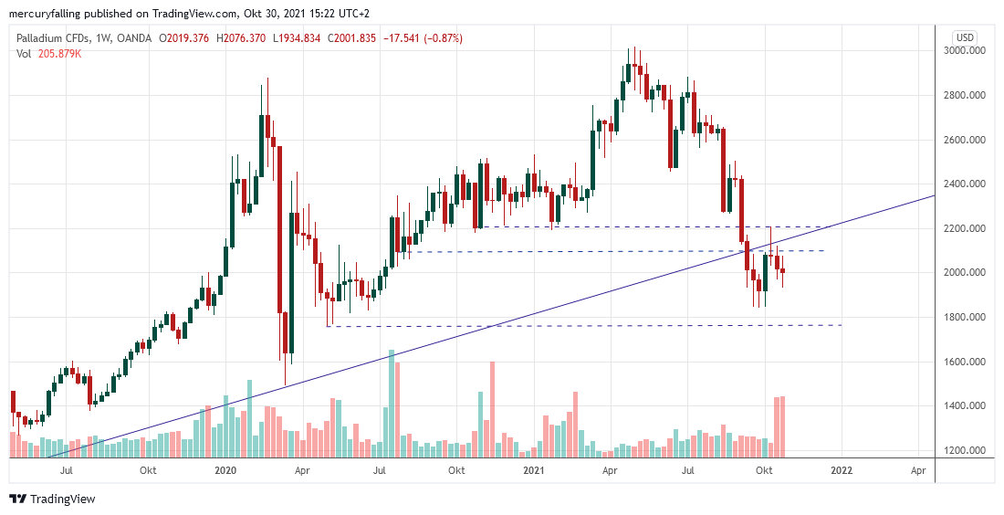 Damit bewegt sich Palladium weiter unter seiner mittelfristigen Aufwärtstrendlinie, welche einen spürbaren dynamischen Widerstand darstellt, der im ersten Anlauf ab dem 11.10.2021 zunächst nicht überwunden wurde. Da die Symmetrie einer möglichen Bodenbildung noch nicht stark erscheint, könnte sich die Korrektur noch etwas fortsetzen. Aus mittelfristiger Perspektive sind allerdings die Chancen gestiegen, dass Palladium oberhalb von 1.921 Dollar eine belastbare Umkehrformation ausbildet.