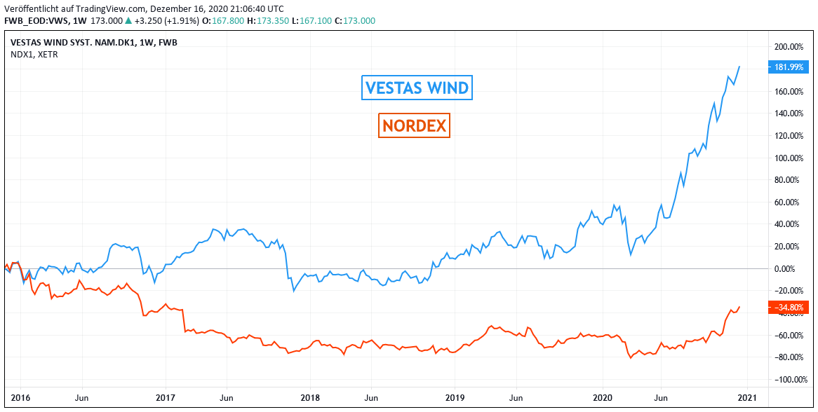 Chart: VESTAS WIND gegen NORDEX (jeweils in Euro)
