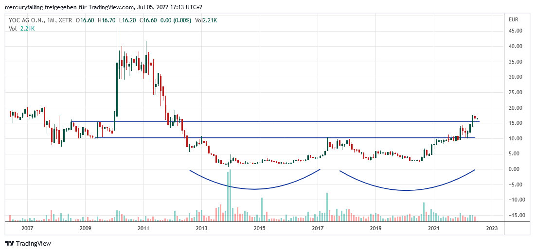 Die operative Verbesserung in Verbindung mit einer dynamischen Internationalisierung der eigenen Werbeplattform haben der Aktie inzwischen die Widerstandskraft gegenüber dem Gesamtmarkt gegeben und dazu geführt, dass der Titel seine 10-jährige Bodenbildung in Form eines ausgeprägten Doppelbodens fast vollendet hat. Zuletzt überwand die Aktie nach der Nackenlinie des Doppelbodens bei 10,50 Euro auch den nächsten Widerstand auf Monatsschlusskurs-Basis bei 15,40 Euro.
