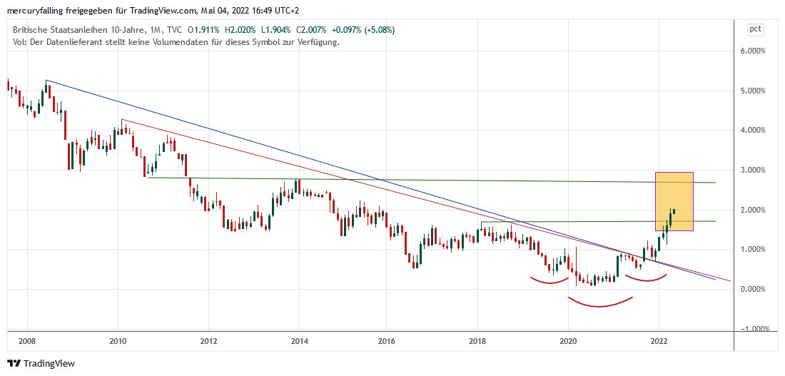 Dabei verstärkt sich auch das seit 2019 gebildete Bodenmuster einer umgekehrten Schulter-Kopf-Schulter-Formation weiter. Dessen Nackenlinie im Renditebereich um 0,9 % war bereits im September 2021 erstmals überwunden worden. Dabei wurden auch die langfristigen Zins-Abwärtstrendlinien gebrochen, was bedeutende langfristige Kaufsignale für die Zinsen generiert hatte.