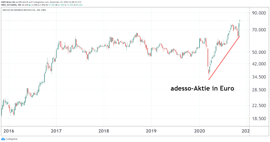 Dem Corona-Crash konnte sich die adesso-Aktie in diesem Frühjahr nicht entziehen. In der Spitze fiel der Titel bis auf 33,05 Euro zurück. Mittlerweile haben die Anleger aber erkannt, dass die Virus-Pandemie die langfristigen Aussichten keinesfalls negativ beeinflussen wird. Obwohl das Papier seit diesem Zwischentief wieder um rund 130 % zugelegt hat, sind weitere Kursgewinne aufgrund der gegenwärtig guten Geschäftsentwicklung und den positiven Zukunftsaussichten möglich.