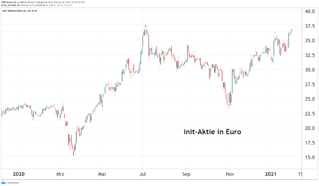 Aus technischer Sicht befindet sich die init-Aktie seit Ende Oktober 2020 in einem relativ steilen kurzfristigen Aufwärtstrend, wobei der Titel aktuell nur knapp unter dem Zwölfmonatshoch, welches auf Xetra am 7. Juli 2020 bei 37,80 Euro markiert wurde, notiert. Sollte diese Widerstandszone jetzt nachhaltig überwunden werden, so würde ein weiteres Kaufsignal generiert, wobei mittelfristig durchaus die Marke von 50 Euro erreicht werden könnte, sofern noch mehr Anleger den bislang noch relativ wenig bekannten Anteilschein für sich entdecken.