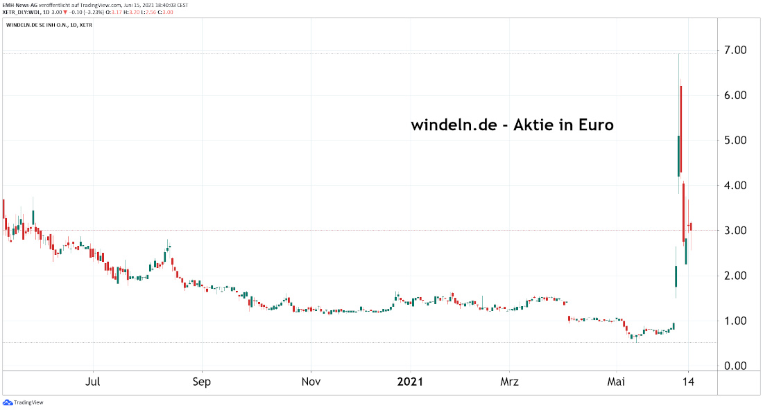 Am 07. Juni berichteten wir frühzeitig über die Spekulationswelle bei dem operativ stark angeschlagenen Unternehmen windeln.de (DE000WNDL201), welches aufgrund der zuletzt weiterhin hohen Verluste eigentlich dringend eine neue Finanzspritze bräuchte. Nachdem sich der Titel nach Veröffentlichung unseres Artikels sogar nochmals fast verdreifachte und durch einige Zocker in der Spitze auf 7,04 Euro getrieben wurde, hat sich der Kurs mittlerweile mehr als halbiert.